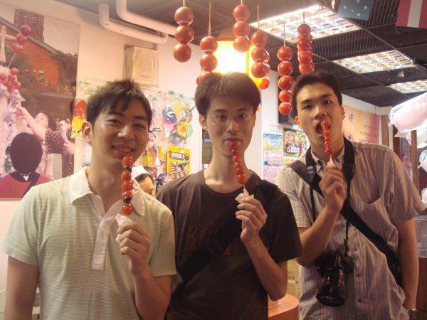 這三個男生在柑仔店一人付35元各買了一支糖葫蘆...明明就是3支100元@@