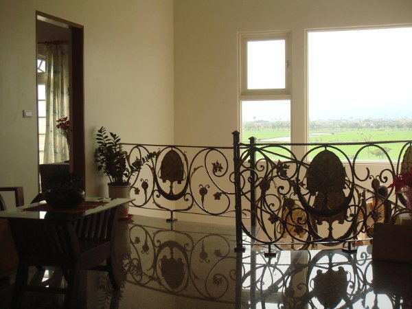 <透過古銅色雕花欄杆可以看到外面的荷花池>